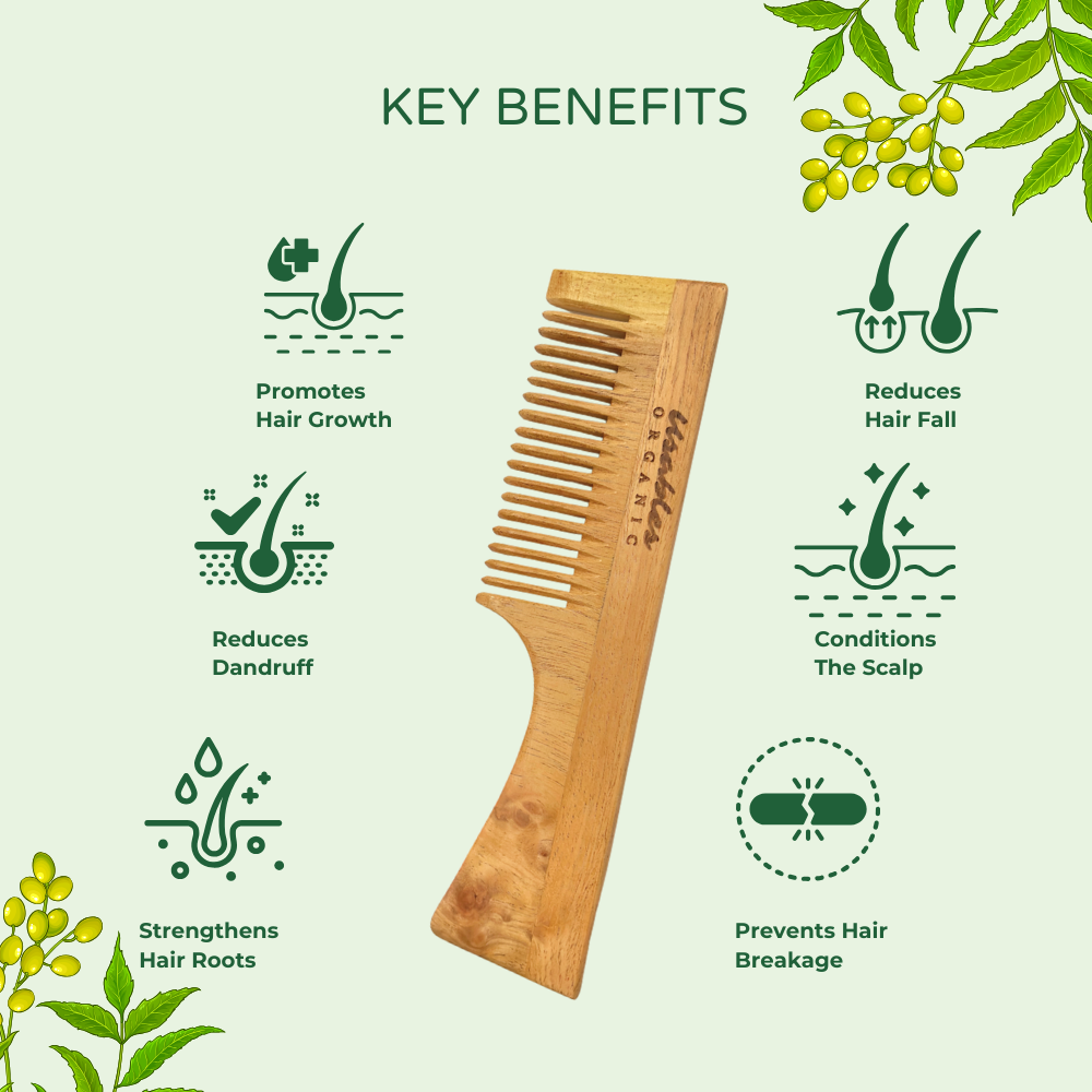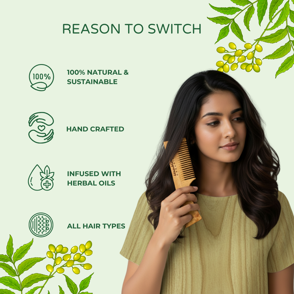 Natural Neem wood helps prevent scalp infections and reduces dandruff by inhibiting microbial growth.